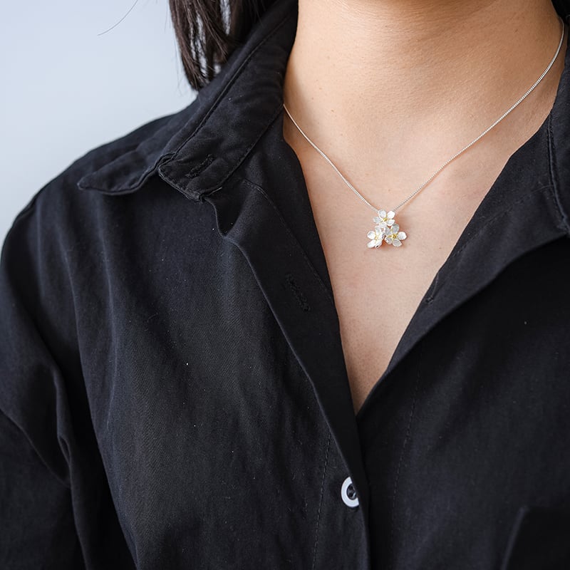 繊細なフラワーモチーフが首元にやさしいアクセントを添えます。